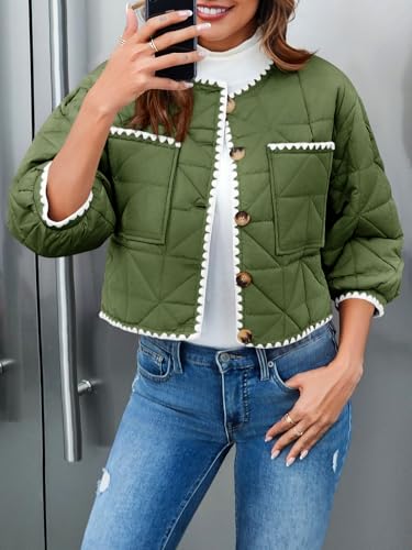 trending ! Tankaneo Womens Cropped Quilted Jacket Winter Lightweight Puff 3/4 Sleeve Button Down Contrast Trim Coat