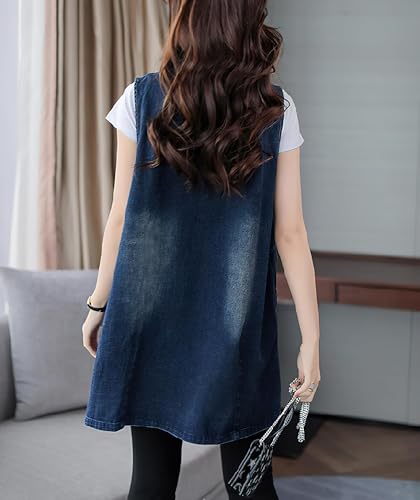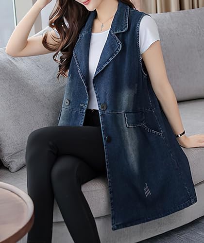 Womens Sleeveless Lightweight Long Denim Vest With Pockets Vintage Button Down Loose Jean Jacket
