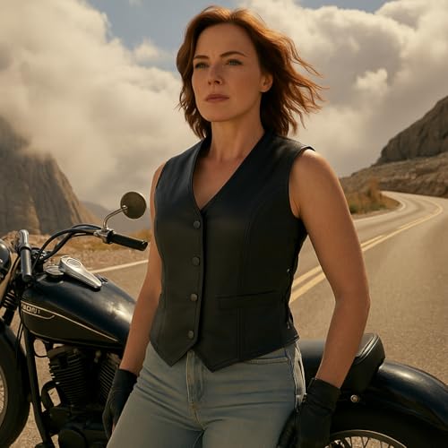 Fabric type: Sheepskin LeatherCare instructions: Towel Wash OnlyOrigin: ImportedPREMIUM GENUINE LEATHER: Crafted from high-quality 100% genuine leather that offers a durable, long-lasting construction with a soft touch and rugged finish, perfect for everyday wear or long rides. Built to age beautifully with a classic biker patina over time.FLATTERING BIKER CUT & CLASSIC DESIGN: Features a timeless V-neck front, form-fitting silhouette, and sleek tailoring that enhances your figure. The snap-button front closure provides a secure yet stylish look that’s easy to layer over shirts, jackets, or hoodies.FUNCTIONAL MULTI-POCKET STORAGE: Equipped with dual front hand pockets and multiple interior pockets to securely carry all your small essentials, such as your phone, keys, wallet, or gloves, making it perfect for riders who value both fashion and function.ADJUSTABLE SIDE LACE DETAILING: Customize your fit with side lace ties that add a stylish edge while allowing flexibility in sizing. Easily worn over thicker garments during colder months or tightened for a snug fit in warmer weather for all-season versatility.ALL-DAY COMFORT WITH INNER LINING: Motorcycle Vests for Women Designed with a soft and breathable polyester lining that ensures a comfortable experience whether you're riding cross-country, attending club meets, or simply heading out for a casual day in biker-inspired fashion. Perfect for everyday use. premium materials and excellent craftsmanship ensure long-lasting durability.