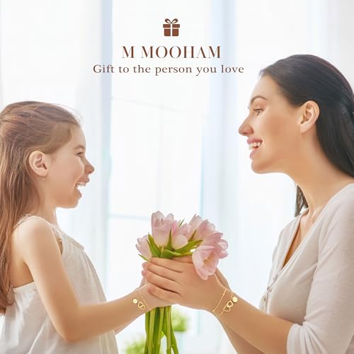 M MOOHAM Gold Initial Bracelets for Women, Dainty 14K Gold Plated Disc Initial A-Z Bracelet Jewelry, Satellite Chain Double Hearts Bracelets, Birthday Gifts for Women Mom Daughter Friend