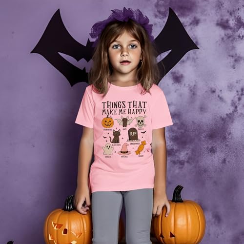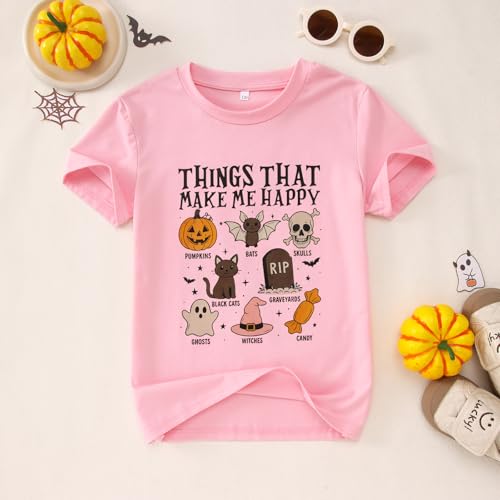 • 【Funny Design】Kids Halloween t shirt, boys girls Halloween cute ghost shirt, Featuring “Things That Make Me Happy” letter print and Halloween elements such as pumpkins, bats, skulls, graveyards, ghosts, witches, candy, black cats, etc. Halloween ghost graphic tees for girls, boys girls round neck Halloween outfits tees, kid boys girls spooky season shirts,Halloween party gift shirts, spooky holiday shirts.