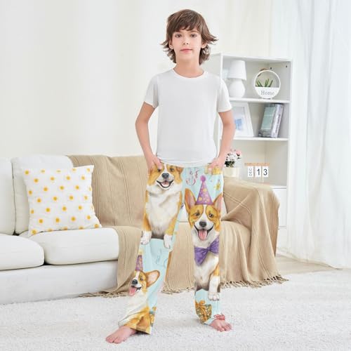 Corgi Dog Birthday Cake Boys Long Pants silky Trousers Elastic Waist Kids Lounge Bottoms with Pockets S-XL