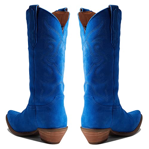 LEHOOR Cowboy Boots Women Embroidered Mid Calf Western Boots Stacked Low Heel Pointed Toe Pull On Cowgirl Boot 4-11 M US