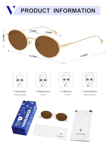 Origin: ImportedIntegrated Streamlined Legs Design: Brought to you in gold-toned metal frame with integrated streamlined legs and rounded lenses, they offer retro appeal with a luxe finish, and definitely a staple for sunny daysUpgraded TAC Polarized Lens: VANLINKER polarized lens can block harmful rays, reduce heat radiation, block 99.99% harmful UVA/UVB rays, anti-glare and anti-reflection, protect your eyes from long-term UV damage when you are outdoorsTrendy Oval Style: Vintage oval frame give you a retro look; Screw tightness is moderate, temples are easy to open and close, bold Color matching offers a timeless sophistication.Just add to your outfit of the day for an instant chic finishProduct Dimension: Lens Width: 55 mm(2.17 inches) | Lens Height: 39 mm(1.54 inches) | Temple Length: 145 mm(5.71 inches) | Nose Bridge: 19 mm(0.75 inches).There may be 1-3 mm deviations by manual measurementExcellent Choice: Sunglasses*1, microfiber pouch*1, microfiber cleaning cloth*1, glasses box*1. It's also a great fashion item for your family and friends impeccable for everyday use. premium materials and excellent craftsmanship ensure long-lasting durability.