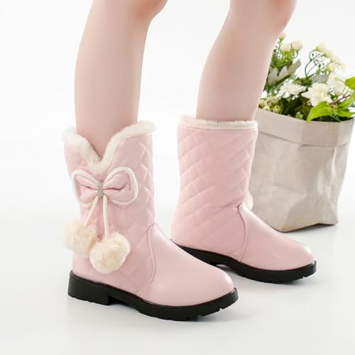 trending ! Girls Winter Mid-Calf Leather heated Fur Boots Bowknot Rhinestone Princess Booties