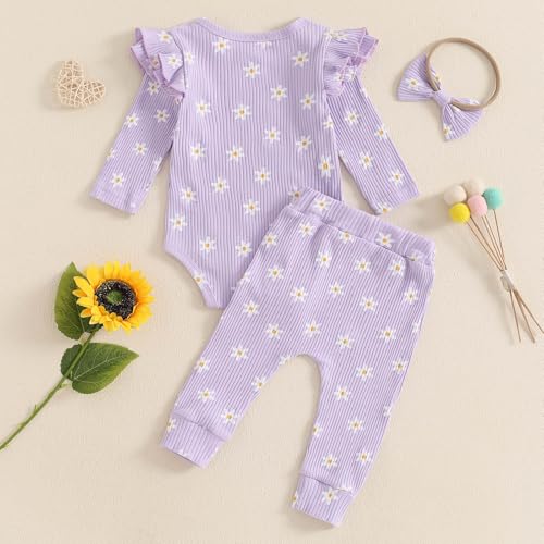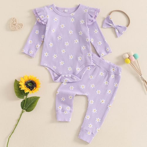 trending ! Newborn Baby Girl Outfits Flower Ribbed Ruffle Long Sleeve Romper and Pant set 3pc Infant Girl Fall Winter Clothes