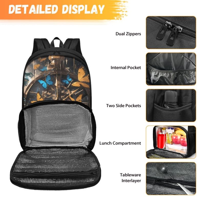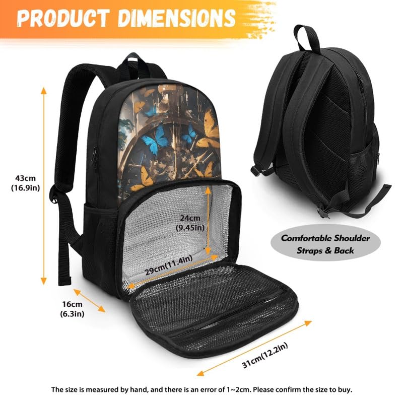 Metal Clock Butterfly Insulated Lunch Backpack for Women Retro present-day Clock Insulated Cooler Backpack Lunch Box Yellow Blue Butterflies Prep Backpack for Picnic College Travel
