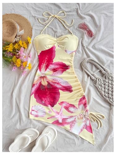 • Feature: Floral Print, Tie Back, Sweetheart Neck, Sleeveless, Backless, Drawstring Side, Asymmetrical Hem, Split, Ruched, Halter Dresses for Women