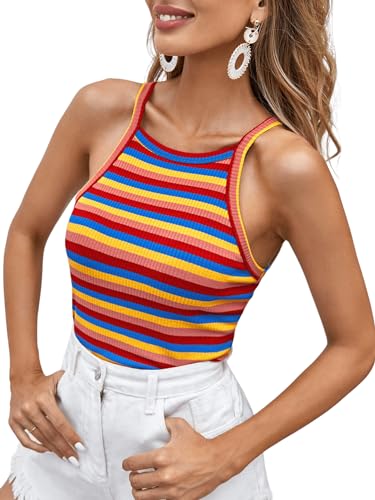 Why Choose Milumia Women Casual Rainbow Striped Ribbed Knit Cami Top Spaghetti Strap Camisole?