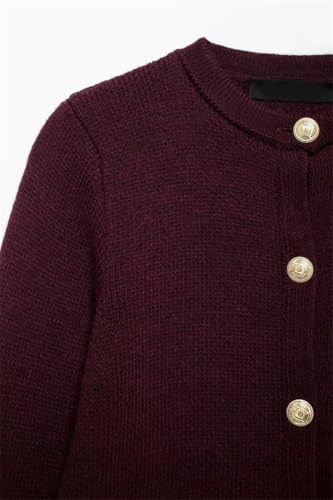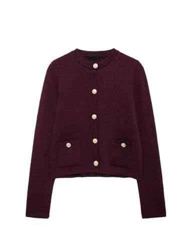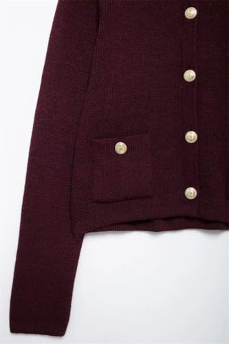 trending ! Women's Knitted Top Wine Red O Neck Long Sleeve Pocket Single Breasted Cardigan Coat