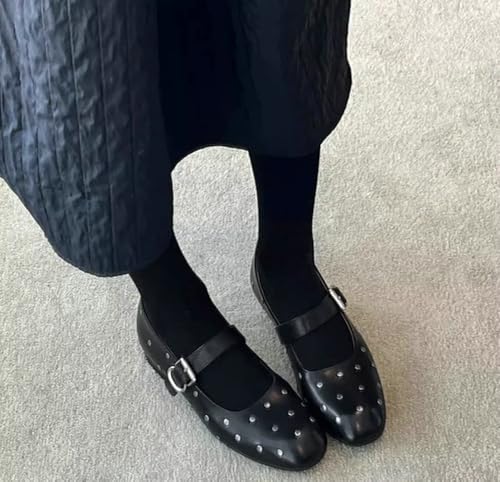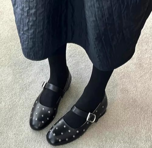 Women's Round Toe Retro Rivet Mary Jane Flat Shoes trendy Single Belt Buckle Dress Shoes Genuine Leather Slip On Flats