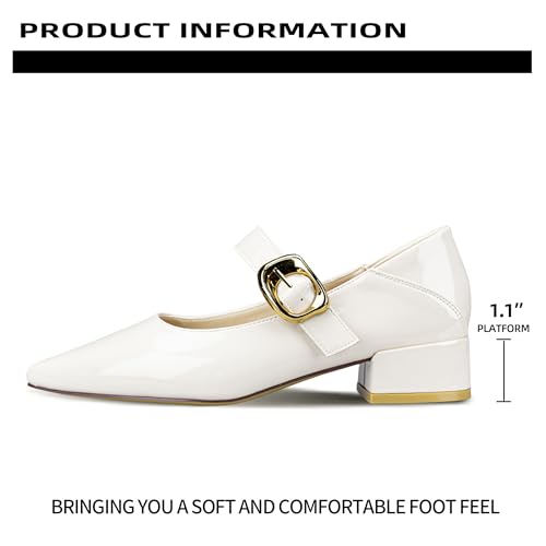 trending ! Women's Patent Leather Mary Jane Flats, Pointed Toe, White with Gold Buckle, Low Block Heel
