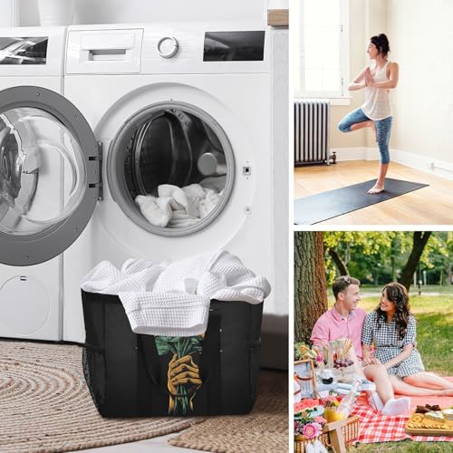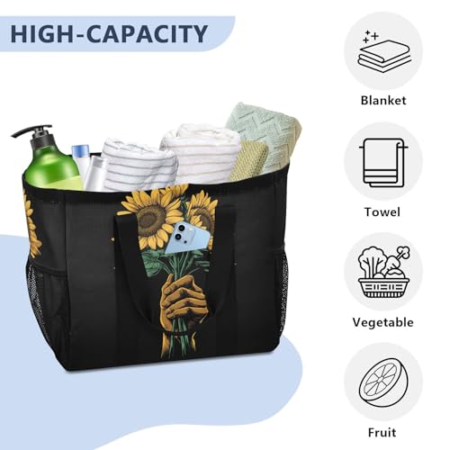 Large Waterproof Travel Tote Bag for Women Men, Hand Flower Sunflowers Canvas Beach Bag with Lining & Pockets - Reusable Grocery/Laundry/Kitchen/Pool/Picnic Tote (15.4x9.8x12.8in)