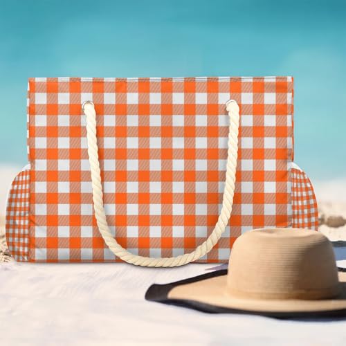 trending ! Orange Buffalo Plaid Tote Beach Bag for Women with Zipper Large Waterproof Sandproof Swim Pool Bag