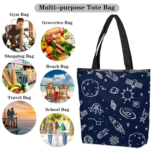 trending ! KOBLEN Space Universe Canvas Tote Bag Reusable Grocery Shopping Bags for Women Beach Travel Storage Handbag with Zipper Portable Shoulder Bag