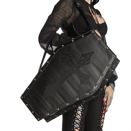 Unique Coffin Design: This weekender bag features a coffin shape with eerie designs on the front and back, adding a twisted, gothic touch to your travel style.Patent Vegan Leather: Made from high-quality vegan leather, this bag is sophisticated, cruelty-free, and durable, making it perfect for all your adventures.Dark Stud Hardware: Adorned with dark stud hardware, this bag combines edgy details with practical durability for all your adventures.Spacious and Secure: At approximately 25L x 15 W x 7D, this bag offers plenty of space for your essentials, while the full zip closure keeps everything secure.Unleash your attitude. We are back of the class, and front of the club. Misfits who are not alone, giving you the power to fearlessly express yourself with original fashion and endless unique looks. Perfect for everyday use. first-class materials and excellent craftsmanship ensure long-lasting durability.