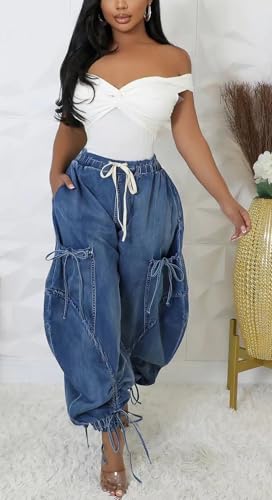 • Material:Womens high wasit casual drawstring baggy cargo joggers jeans trendy streetwear made by polyester. It is skin-friendly, cushy and breathable fabric