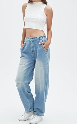 loveimgs Women Boyfriend Mid Rise Baggy Jeans Barrel Pants Denim Wide Leg Pull On Jeans Cargo Y2k Distressed Stretchy