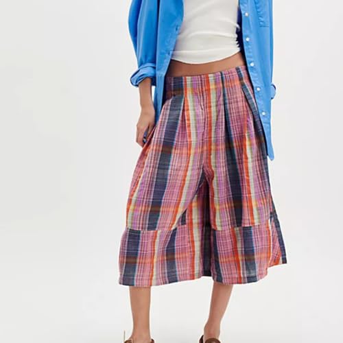 trending ! Womens Summer Boho Wide Leg Culotte Retro Plaid Pants PalazzoTrousers Colorful Plaid Capris with Pockets