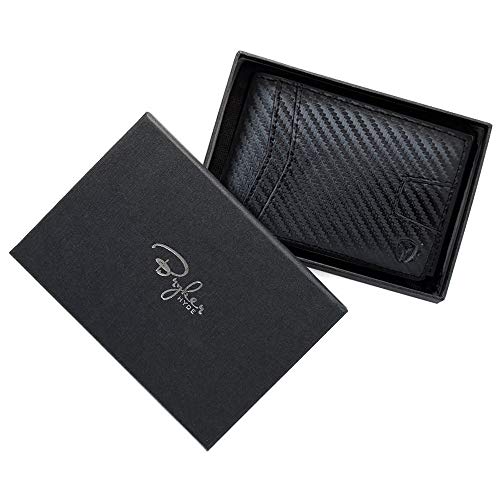 Brand: Bryker HydeColor: Carbon Fiber Black w/Pull Out Card PocketMaterial: LeatherStyle: MinimalistPattern: SolidSLIM ELITE FEATURES: This wallet is designed for those who want a Slim Front Pocket wallet that carries a little bit more. With 8 card slots + 1 ID window + 1 bill / receipt pocket + Pull out card pocket and first-class stitching throughout, you will not be short of space for all your important cards (hold up to 11 cards.) The dimensions of the wallet (4.25 inches H x 3.5 inches W x 0.25 inch Thin) allow it to slip in and out of any pant or shirt pocket with ease.LUXURY LEATHER, AFFORDABLE, fashionable and FUNCTIONAL: Using full grain distressed leather, each wallet is truly one of a kind and will gain natural character over time. You will enjoy the touch and feel of this leather for years to come.IDEAL FOR TRAVEL AND WHEN YOU'RE ON THE GO: Whether you’re an avid traveler, use public transportation, live overseas, or enjoy vacations abroad, this wallet combines practicality with security. Wherever you go, you will be able to store currency bills and cards and be shielded against unwarranted RFID NFC and BLE scans. While others suffer identity theft, you won’t.2 YEAR WARRANTY: Our warranty covers any factory defects as a result from the manufacturing process of the productGIFT FOR ANY OCCASION: Packaged in a stylish gift box, the Bryker Hyde RFID Wallet makes an excellent gift for birthdays, anniversaries, Valentine's Day, Father’s Day, Christmas, or special occasions. A thoughtful and practical present for husbands, fathers, brothers, and business professionals. Perfect for everyday use. High quality materials and excellent craftsmanship ensure long-lasting durability.