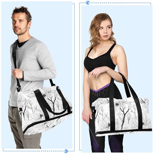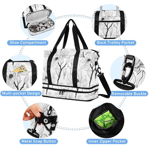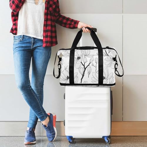 Flower Line White Travel Duffel Bag for Women Men Gym Bag with Shoe Compartment Wet Pocket Carry On Weekender Overnight Bags for Airline Travel Under Seat