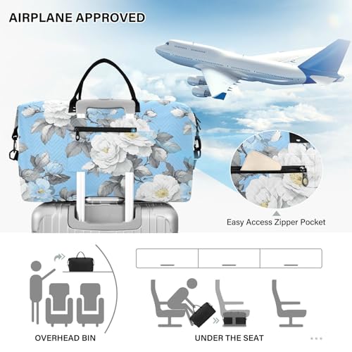Rose Travel Gym Bag, Rose White Spring Pattern Weekender Overnight Duffle for Women with Toiletry Bag Travel Swim