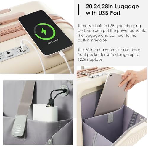 【Carry-On Suitcase - Versatile Combo Set】This set features a 20-inch carry-on luggage and a travel bag, ideal for both short trips and extended journeys. The front-opening design of the cases allows for easy access to your belongings, simplifying both packing and unpacking.【Luggage with Built-In USB Charger】Stay connected wherever you go with our built-in USB ports (power bank not included).Charge your smartphone or tablet on the go and never worry about running out of battery while traveling.【Convenient Travel Features】Our suitcase set is designed with thoughtful features to enhance your travel experience. It includes a cup holder for your beverages and hooks for hanging accessories or small bags, keeping your essentials within reach.Stay organized with these practical features and enjoy effortless access to all your travel necessities.【Expandable Storage Capacity】The included travel bag features an expandable design, offering extra space to carry more items with ease.Its waterproof interior lining provides added protection, ensuring your valuables are safe from spills and moisture during your travels.【robust and Easy to Maneuver】Crafted from tough ABS material, this suitcase set offers exceptional durability and protection for your belongings.Equipped with 360-degree spinner wheels, the luggage effortlessly glides in any direction, allowing for smooth, silent movement. Perfect for everyday use. premium materials and excellent craftsmanship ensure long-lasting durability.