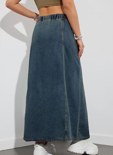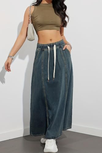 loveimgs Women Elastic High Waist Long Denim Skirt Jean Skirt Cargo Flare A Line Maxi Dress Western Skirt Pocket