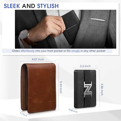 • COMPACT, BUT AMPLE SPACE - Despite its slim design,our wallet for men holds up to 6-8 cards. The elastic cash strap acts as a money clip, allowing you to hold 10-17 folded bills securely on the backside of your card case