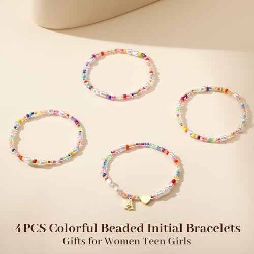Colorful Initial Bracelets for Girls - 4PCS Gold Stretchable Boho Beaded Pearl Heart Initial Bracelets for Women Teen Girl Gifts Trendy Stuff Cute Stackable Jewelry Set Birthday Gifts