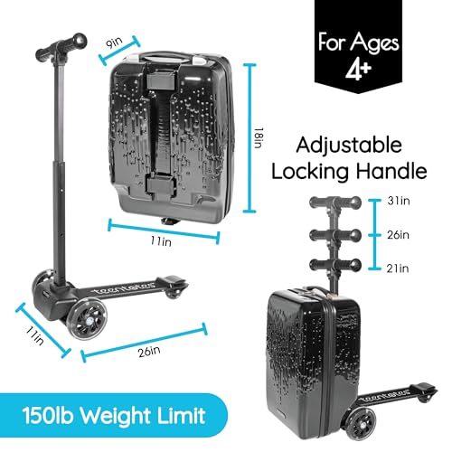 Brand: TEENTOTESColor: BlackAge Range (Description): KidsSpecial Feature: Lightweight, TSA-Approved, Telescoping Handles, Water-Resistant, Zippered DividerWeight Limit: 150 PoundsProduct Dimensions: 9L x 13.5W x 21HNumber of Wheels: 3Model Name: DripWheel Material: PolyurethaneFrame Material: AluminumREMOVABLE LUGGAGE BODY – Detach the suitcase from the scooter for year-round fun. Use it as a ride-on scooter at home or as a carry-on travel companion on family vacations.DURABLE HANDLE & ADJUSTABLE STEM – Strong handle grips and a 3-stage, self-locking adjustable stem grow with your child, ensuring a plush, secure ride for different ages and heights.MACHINED DECK & FLUSH BRAKE – Sturdy scooter deck with a machined plate offers better grip and long-lasting durability. The rear brake sits flush when folded for safety and easy storage.SAFETY-FOCUSED DESIGN – Two-button locking handlebars keep little riders secure, and the folding system is easy for parents to operate while preventing accidental closure.TRAVEL-READY LUGGAGE – Scratch-resistant panels, 360° wrap-around designs, smooth-rolling wheels, and a top handle make it easy to carry—whether attached or detached from the scooter. Perfect for everyday use. first-class materials and excellent craftsmanship ensure long-lasting durability.