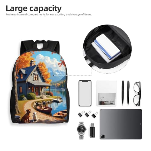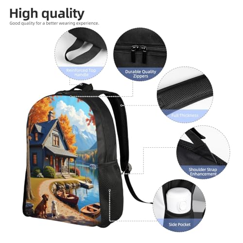 trending ! Comfort Fit Unisex Autumn Cottage by The Lake Dogs Boats Backpack Gre Design tough Daily Commute Travel Adventures 16 Inch