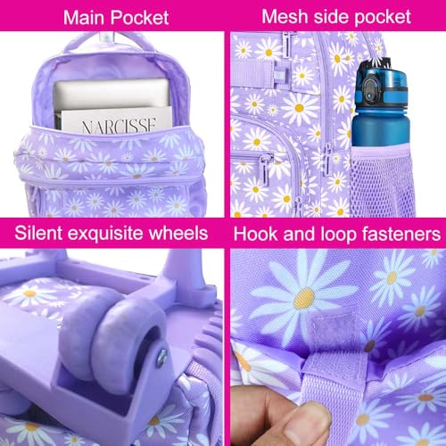Rolling Backpack for Girls, Women Roller Wheels Bookbag, Laptop Daisy Wheeled School Bag with Wheels for Teens