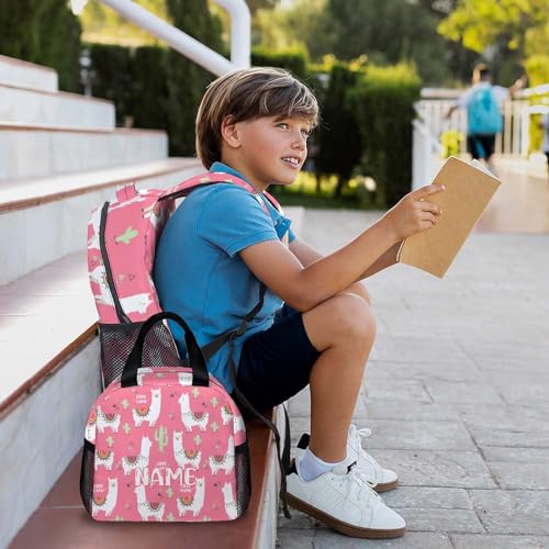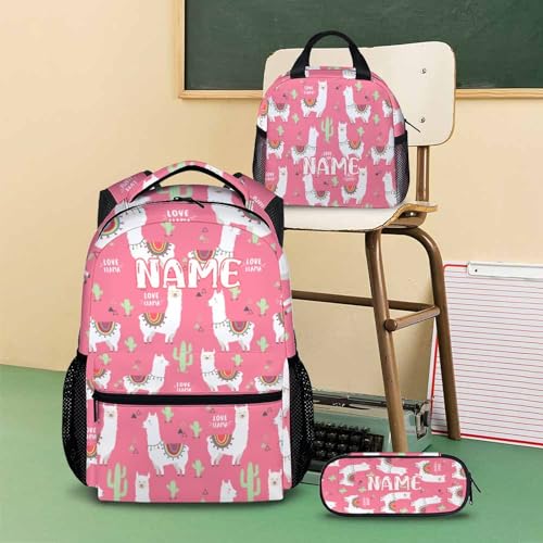 Custom Kids Backpack with Lunch Box Set, 3 in 1 School Backpacks Matching Combo for Boys Girls, Personalized Cute Alpaca Bookbag and Pencil Case Bundle