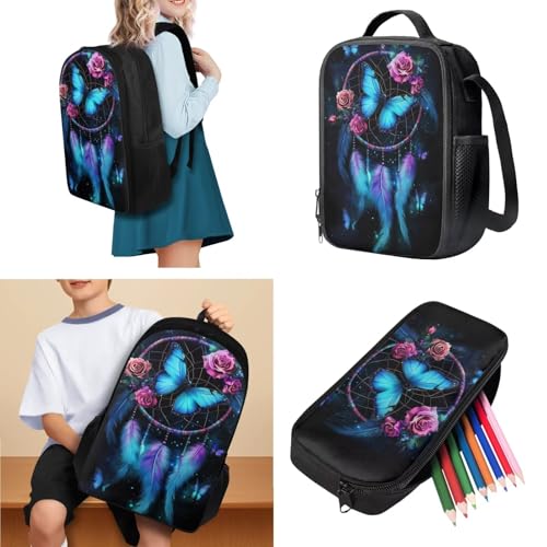 Dreamcatcher Butterfly Backpack for Girls 12-14 Aesthetic Girls Backpack with Lunch Box Pencil Case Water Bottle Sleeve for Elementary Middle School Teens Bookbag Set of 4 Pcs