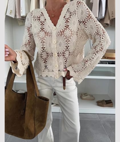 SOMTHRON Women's Boho Hollow Out Crochet Knit Crop Cover Up Long Sleeve Button Down Beach Shirt Tops