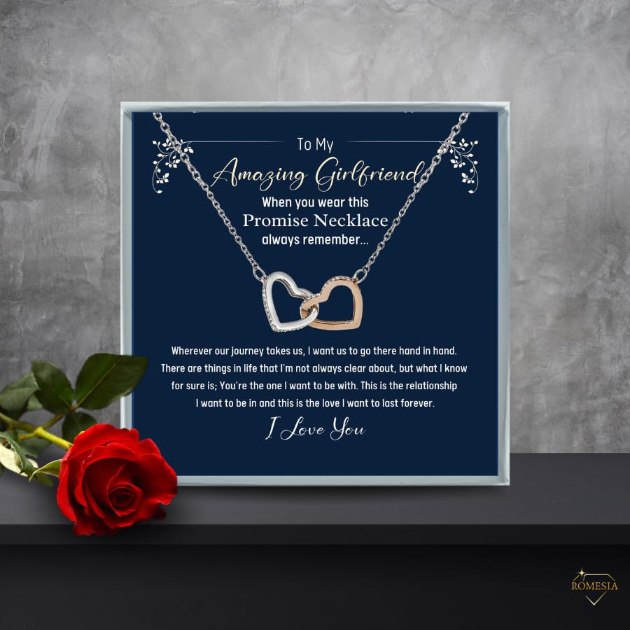 Item width: 3.38 inchesMaterial: Gold PlatedMetal type: Stainless SteelClasp type: LobsterChain type: CableGem type: Cubic ZirconiaMessage Reads: To My Amazing Girlfriend When you wear this Promise Necklace always remember;;; Wherever our journey takes us, I want us to go there hand in hand; There are things in life that I'm not always clear about, but what I know for sure is; You're the one I want to be with; This is the relationship I want to be in and this is the love I want to last forever; I Love YouTIMELESS DESIGNS: Each unique love necklace for girlfriend is stunning and stylish and comes with a heartfelt message card making it a great choice for a one year anniversary gifts for girlfriend; These compliment any wardrobe and are designed to be everyday wear; Paired with our exclusive message card designs they make a unique to my wife necklace gift for wife or soul mate necklace for women; Given as a birthday gift from boyfriend, Valentine’s day gifts, Christmas gift or a just because gifEXPRESS YOUR LOVE IN STYLE: ; Each necklace is paired with a heartfelt message card, making it the perfect romantic gift for future wife ;When you need soulmate gifts or a necklace gift for future wife look no further, Romesia is the perfect choice; Whether you're looking for romantic gift ideas , a birthday gift from future husband, or anniversary gifts our necklace is a timeless piece that will remind her of your love every time she wears itMESSAGE CARD: To MyAmazing Girlfriend -When you wear this Promise Necklace always remember;;; Wherever our journey takes us, I want us to go there hand in hand; There are things in life that I'm not always clear about, but what I know for sure is; You're the one I want to be with; This is the relationship I want to be in and this is the love I want to last forever; I Love You Perfect for everyday use. first-class materials and excellent craftsmanship ensure long-lasting durability.