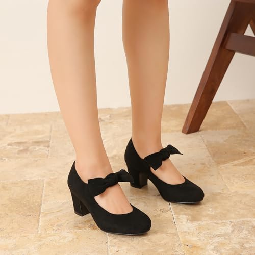 Women's Bow Heels Mary Jane Chunky Heels Pumps Closed Round Toe Comfort Low Block Heel Ankle Strap Wedding Dress Evening Party Shoes
