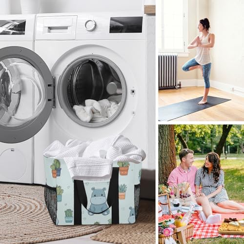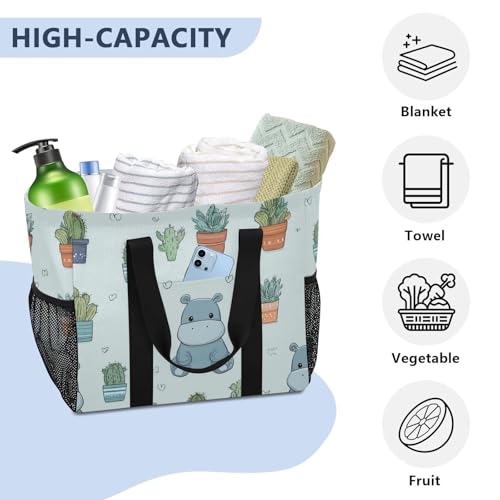 Hippopotamus and Green Plant Patterns Beach Tote Pool Bags for Women Ladies Large Waterproof Gym Tote Carry On Bag for Weekender Swim Gym Shopping Travel Daily Bag