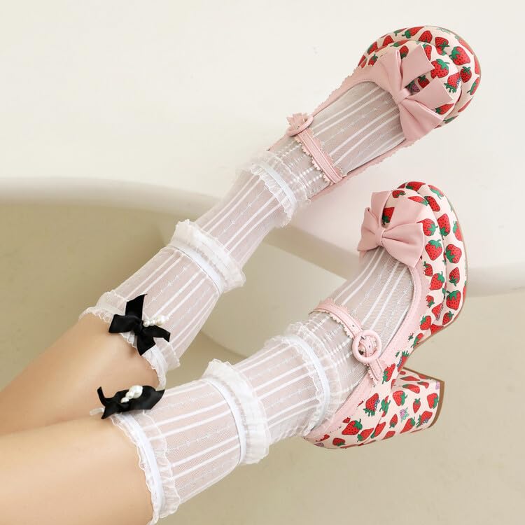 trending ! Women's Strawberry Printing Mary Janes Platform Square High Heel Pumps