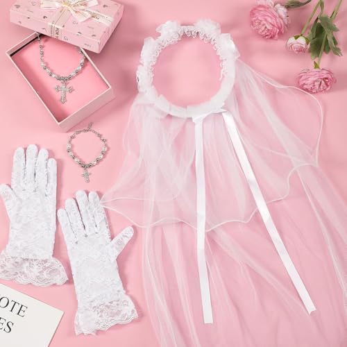 AUGSUN 4Pcs Girls First Communion Veils Set - White Pearl Floral Crown Veil, Lace Gloves, Necklace & Bracelet for Girls Wedding Party Costume