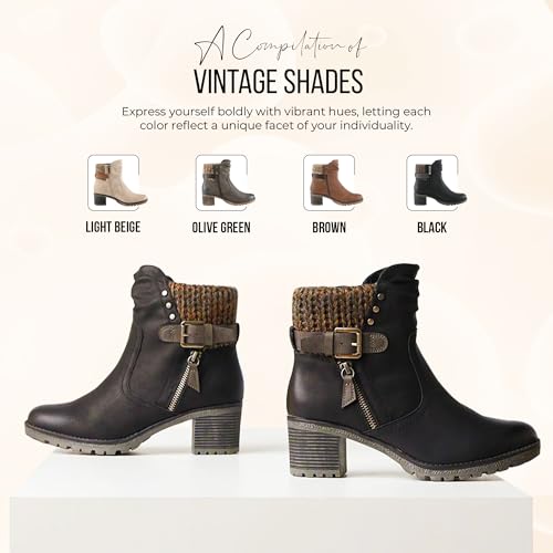 • 𝐕𝐄𝐆𝐀𝐍 𝐋𝐄𝐀𝐓𝐇𝐄𝐑: Crafted with first-class vegan leather, these women's waterproof ankle boots offer a sleek, contemporary look while being eco friendly. The brushed texture gives the boot a unique worn in appearance that adds a touch of charm. Enjoy the fashionable, sustainable alternative to traditional leather.