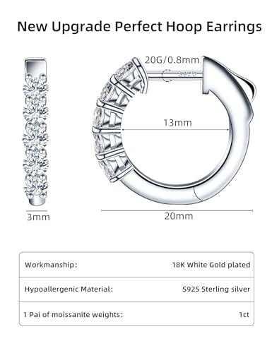Item width: 0.6 inchesMaterial: Sterling SilverMetal type: Sterling SilverBack Finding: Lever Back, Push BackEarring design: HoopGem type: Moissanite【Moissanite Hoop Earrings】Crafted with 100% D-grade moissanite and VVS1 clarity, these delicate hoop earrings feature a 12mm inner diameter and 1.0ct per pair (0.1ct x 5 stones). Certified by GRA for authenticity and quality, they combine exceptional brilliance with diamond-like durability, resisting chipping and maintaining sparkle over time. Made from 18K white gold-plated 925 sterling silver, these earrings are lightweight, skin-friendly, and perfect for everyday wear.【Upgraded Secure Design】These cartilage earrings feature a hand-polished clasp and an upgraded press-on closure, designed to resist bending and breaking. The handmade stone setting (no wax) ensures stones stay securely in place, even with daily wear. long-lasting, lightweight, and crafted for long-lasting comfort, they combine style with reliable security for your favorite moissanite jewelry.【Hypoallergenic Earrings】Crafted in authentic 925 Sterling Silver base with 18K White Gold plating, these moissanite earrings meet standards for nickel-free and lead-free jewelry. Ideal for sensitive skin, the oxidation-resistant coating prevents green/red discoloration and itching.【Perfect Surprise Choice】 Elegant moissanite earrings presented in a luxury gift box with GRA certification and thank-you card. A timeless jewelry piece perfect for celebrating life's meaningful moments. Thoughtful gift for mothers, wives, daughters, friends or yourself - crafted to cherish every occasion.【Sayata Jewelry's Commitment】We're passionate about discovering beauty through fashion jewelry. Devote ourselves to crafting high-quality pieces that elevate your style without breaking the bank. Empowering you to express confidence without compromise. Perfect for everyday use. first-class materials and excellent craftsmanship ensure long-lasting durability.