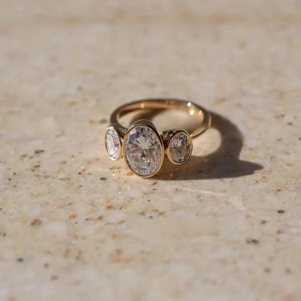 5 Carat Oval Cut Moissanite Engagement Ring 14 k Yellow Gold Three Stone Bezel Set Trilogy Wedding Ring Promise Anniversary Jewelry For Women Thank you Gift For Wife
