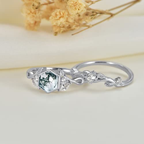 925 Sterling Silver Hexagonal Natural Moss Agate Engagement Ring for Women CZ Stackable Promise Rings Jewelry Set