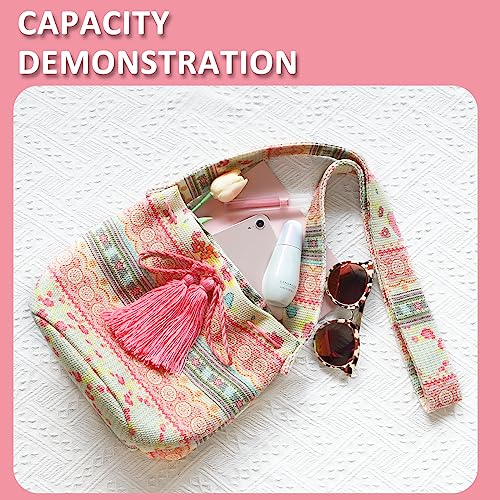 • 【Bohemian Crossbody Bags for Women】Bohemian women's crossbody bag distinctive bohemian handbag, beige as the base color, there are 5 layers of pattern splicing into a characteristic pattern, pink creative tassel drawstring, shoulder straps and the body of the bag for the same pattern, full of details, show youthful vitality, canvas bucket bag to add a sense of beauty and design, fashionable design to bring the handbag to life, stand out in the crowd