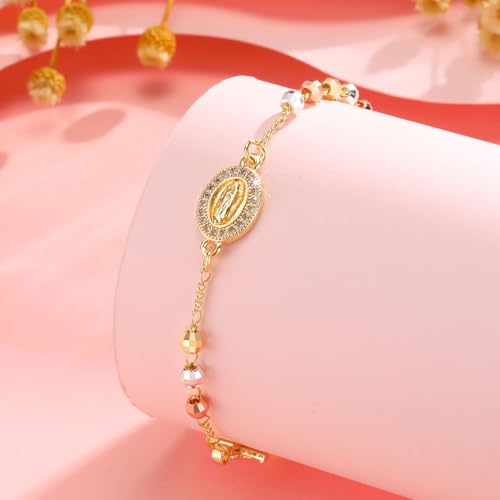Catholic Crucifix Gifts Rosary Bracelet for Women-14K Gold Virgin Mary Jesus Cross Charm Link Chain, Dainty Virgen de Guadalupe Religious Gift for Confirmation Baptism First Communion Easter