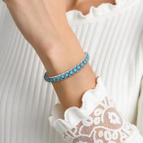 • Special Design: The design inspiration of this turquoise bangle is Bohemian style. The bracelet is inlaid with stunning turquoises, adding a touch of bohemian chic to any outfit. Important Note: these turquoises are synthetic turquoises, not real ones.
