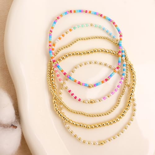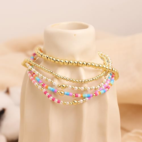 Gold Beaded Stack Bracelets Set for Women, 5Pcs Cute Boho Handmade Colorful Small Beaded Stackable Friendship Stretch Bracelets Prom Jewelry Gift.