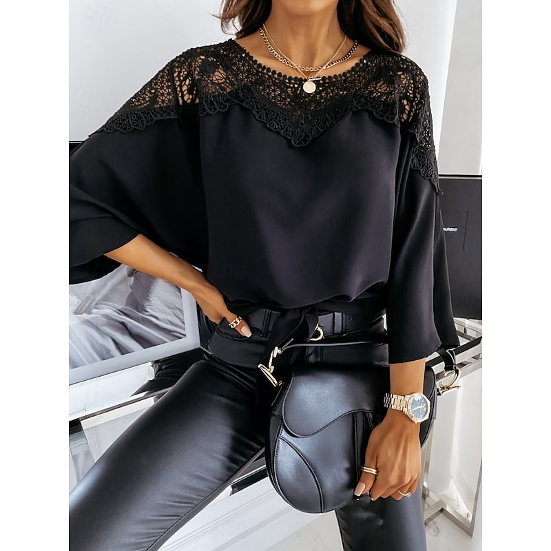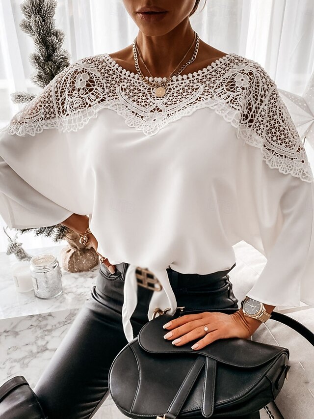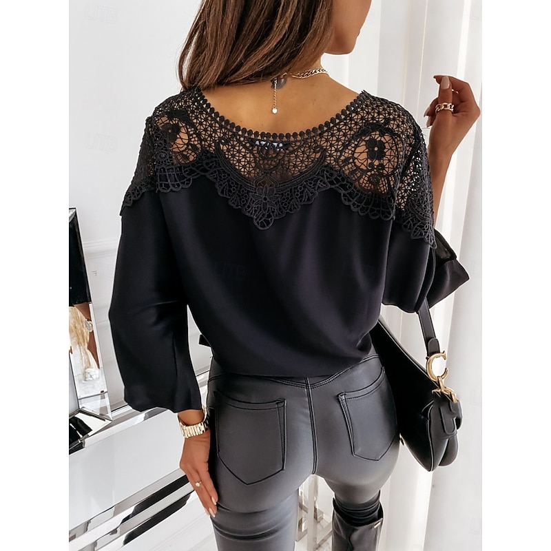 trending ! Women's Shirt Blouse Solid Color Basic Casual Long Sleeve Crew Neck Regular Tops Daily Lace Patchwork Black White Fall Winter